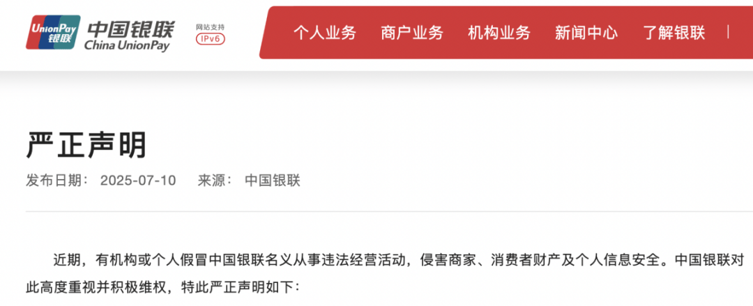 7月10日,中国银联官网挂出一则《严正声明》称,近期,有机构或个人假冒中国银联名义从事违法经营活动,侵害商家、消费者财产及个人信息安全。中国银联对此高度重视并积极维权。